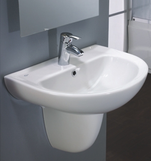 55 cm Lavatory with large wall pedestal. Includes one punched and two semi-punched faucet holes, White.
